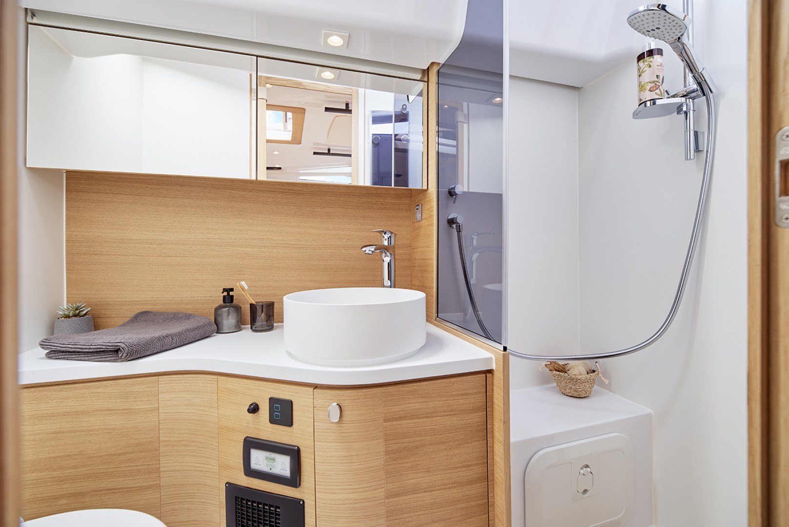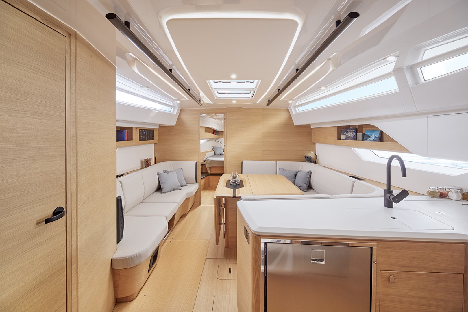 Unter Deck überzeugt die Elan E6 durch ein helles und modernes Design mit viel Weiss und hellem Eichenholz. Das Layout an sich ist eher konservativ, aber dafür in vielen Details gut ausgearbeitet – mit einer besonders grossen Küche, gut dimensionierten Badezimmern und viel Stauraum, auch in den Bilgen. Das Schiff ist mit drei oder vier Kabinen erhältlich; die beiden Achterkabinen sind in jedem Fall gross und luftig; die Eignerkabine im Vorschiff ist, bei der Drei-Kabinen-Version, geradezu riesig. Deutlich keiner wird es hier, sofern die Option der vierten Kabine wahrgenommen wird. Das sind dann zwei Einzelbetten übereinander zwischen Hauptschott und Doppelbett vorne in einer eigenen, abgetrennten Kammer.
